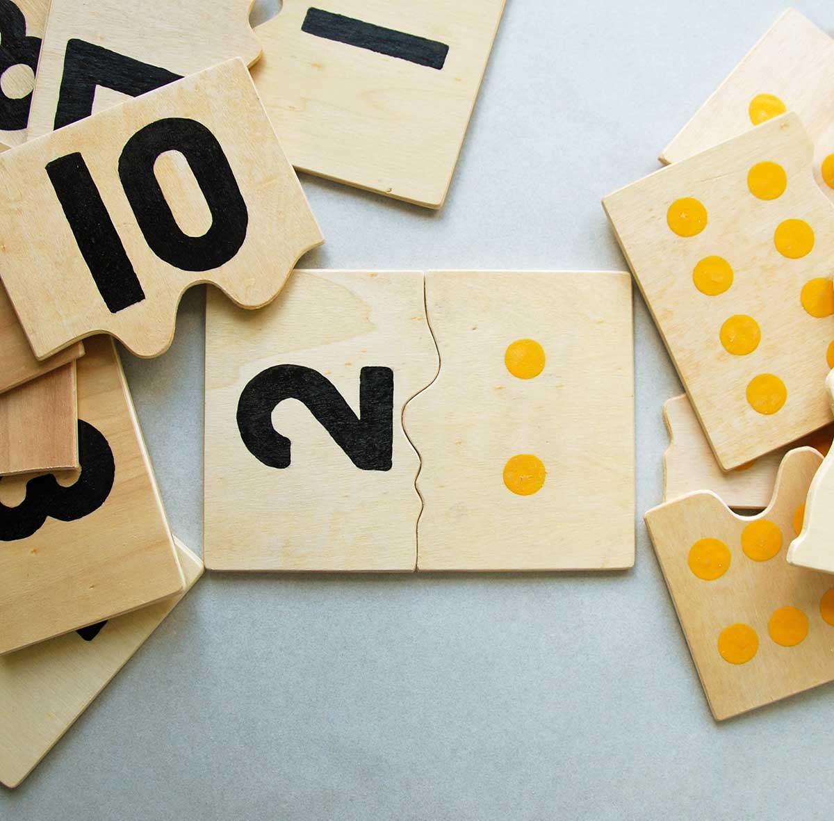 Håndlavet puslespil i trææske. Brikker med tal fra 1 til 10 skal kombineres med brikker med tilsvarende antal prikker. En god måde for de 2-4 årige at blive fortrolige med tallene. Malet i hånden på fyrretræsfiner. Æsken måler 20x14x7 cm.